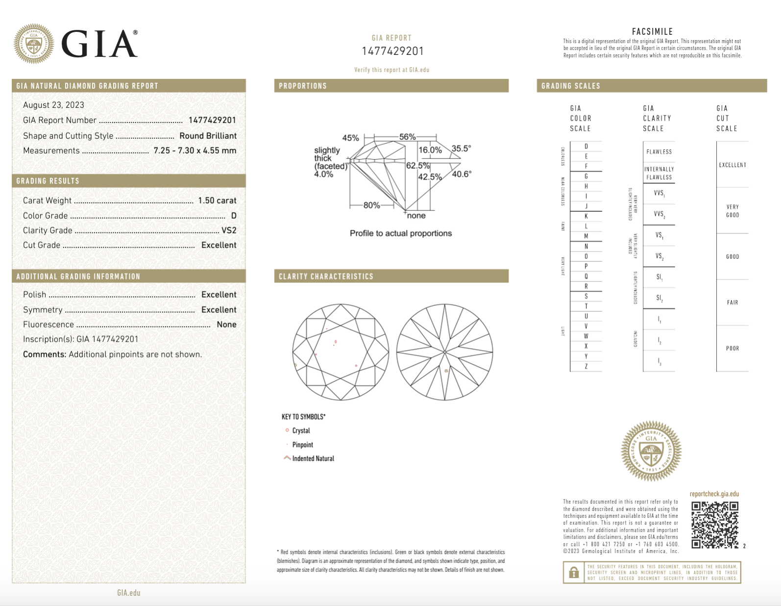 Round 1.50ct D VS2 3EX None 7.25 - 7.30 x 4.55 G